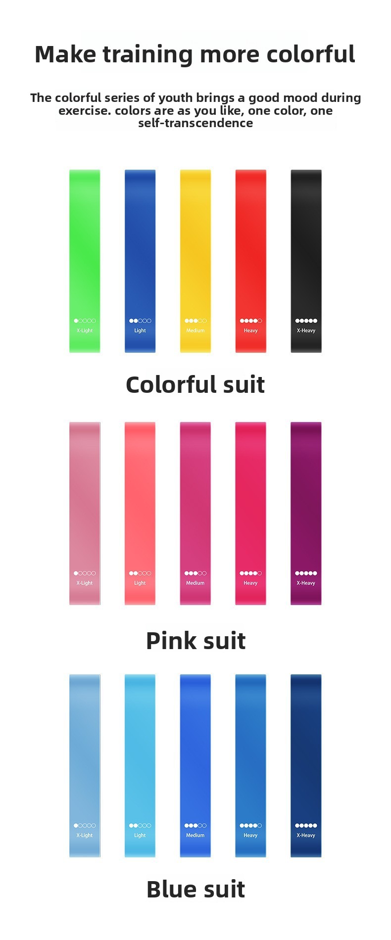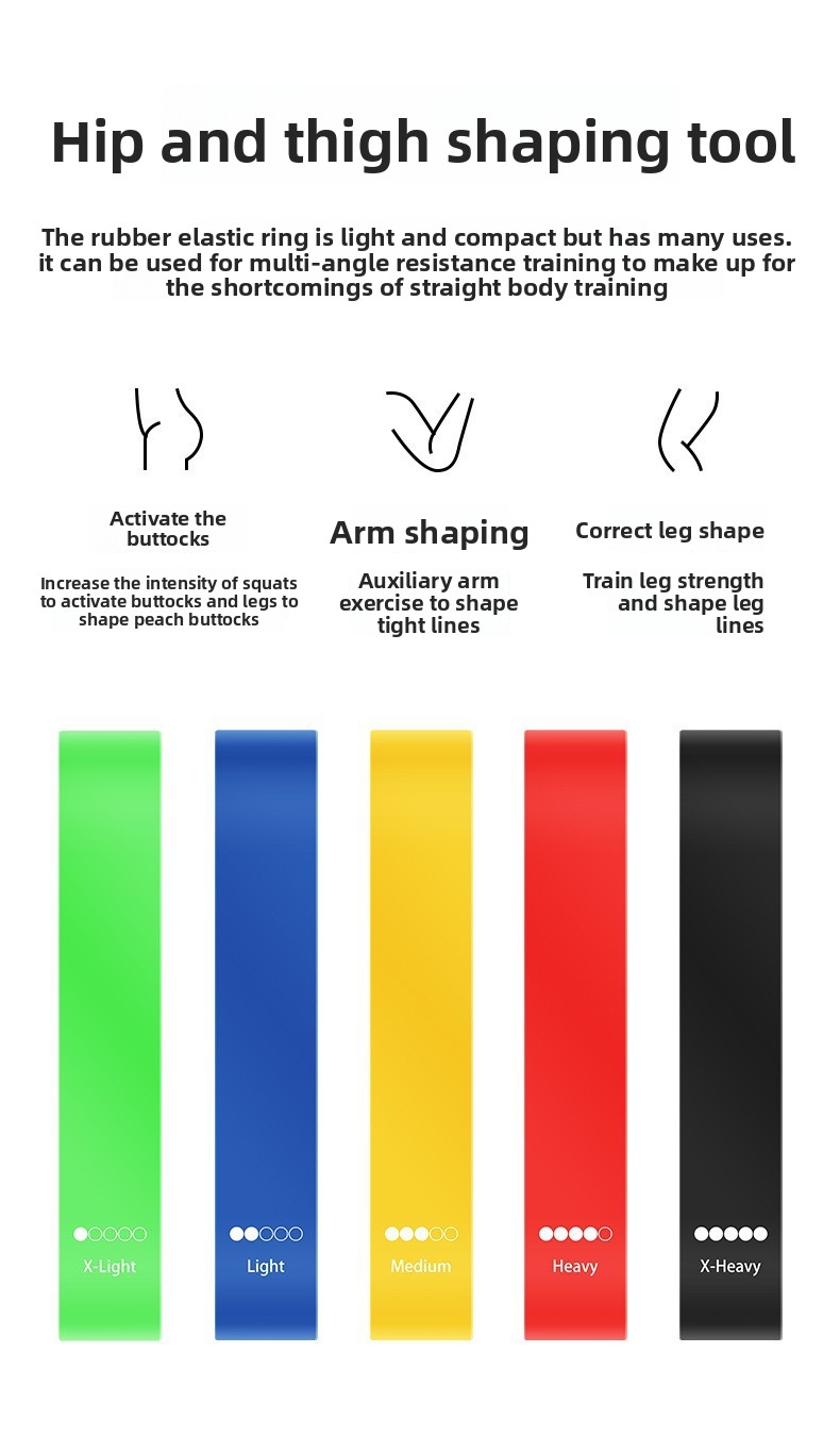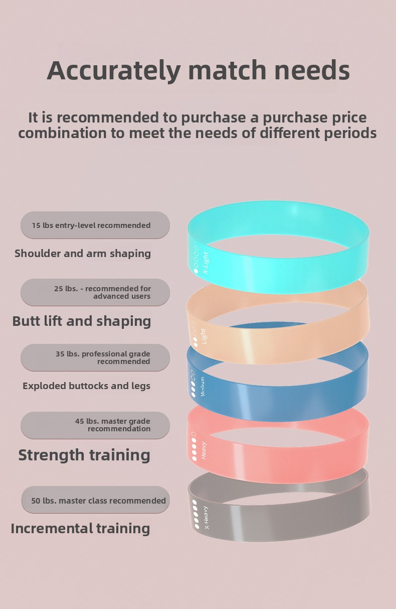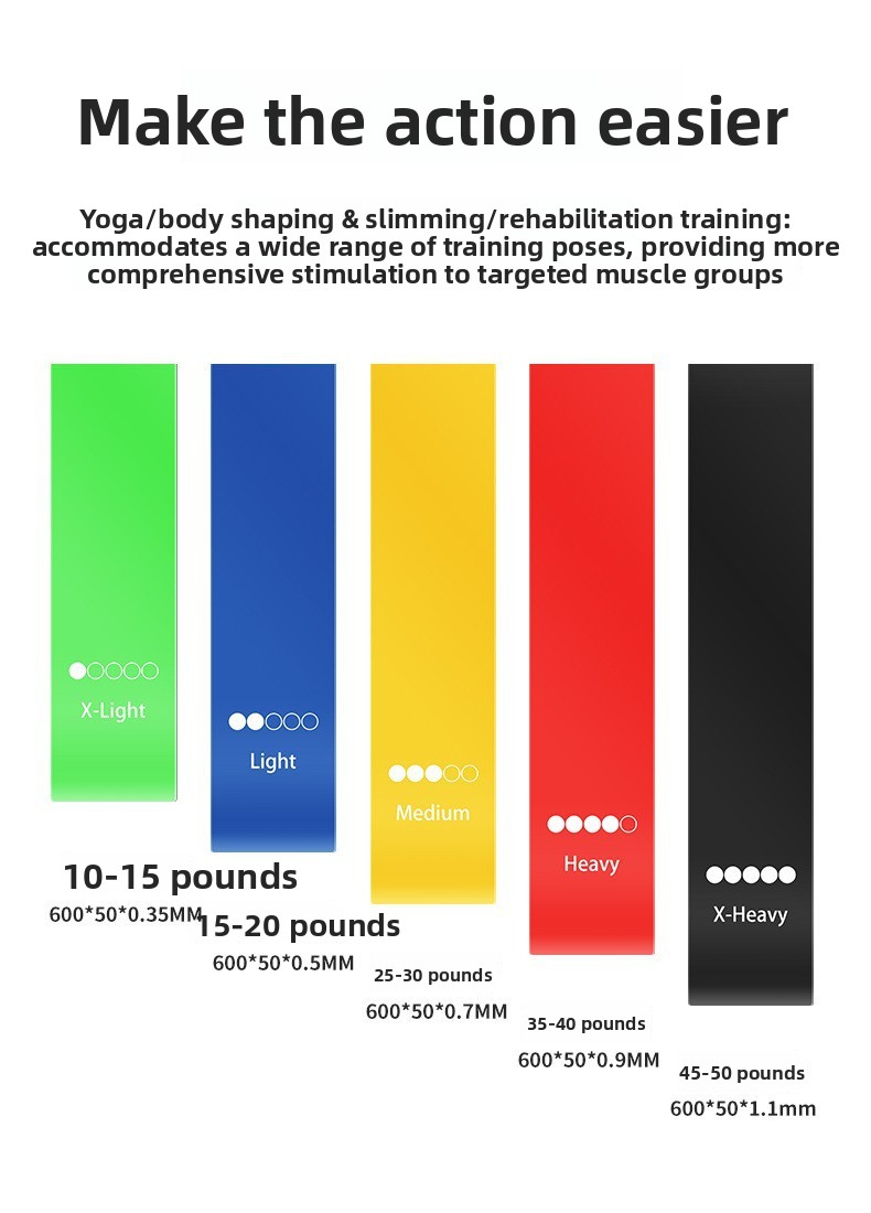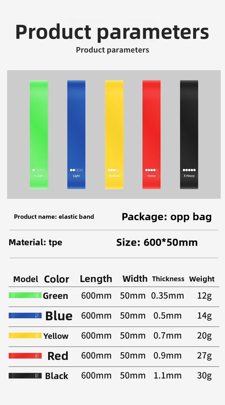 Set Configurations: Single bands or sets of 5 with optional strength markers, instruction manuals, and cloth bags